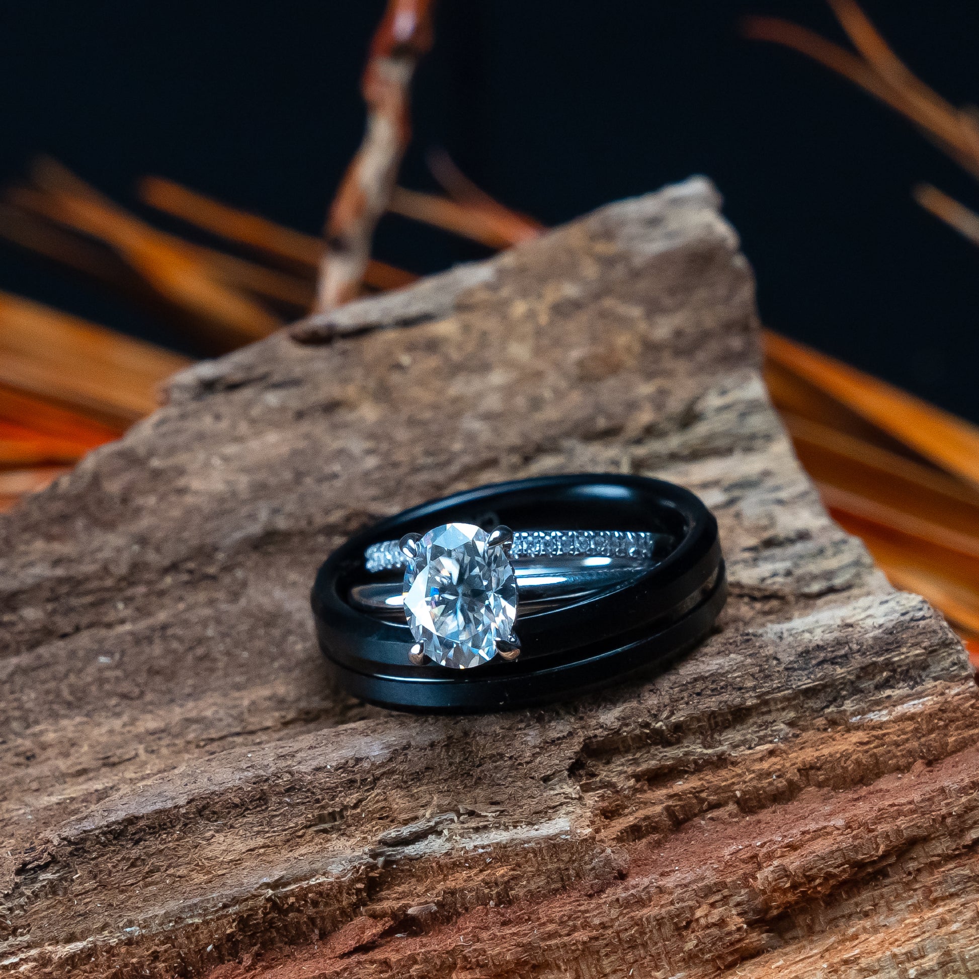 The Bonang & Tlhoriso set is where timeless sparkle meets modern minimalism. Bonang features a breathtaking 2ct oval moissanite set in sterling silver, complemented by a half eternity band for added brilliance. Tlhoriso offers a sleek contrast with a 6mm all-black tungsten band—effortlessly strong and understated. Together, they embody a perfect balance of shine and strength.