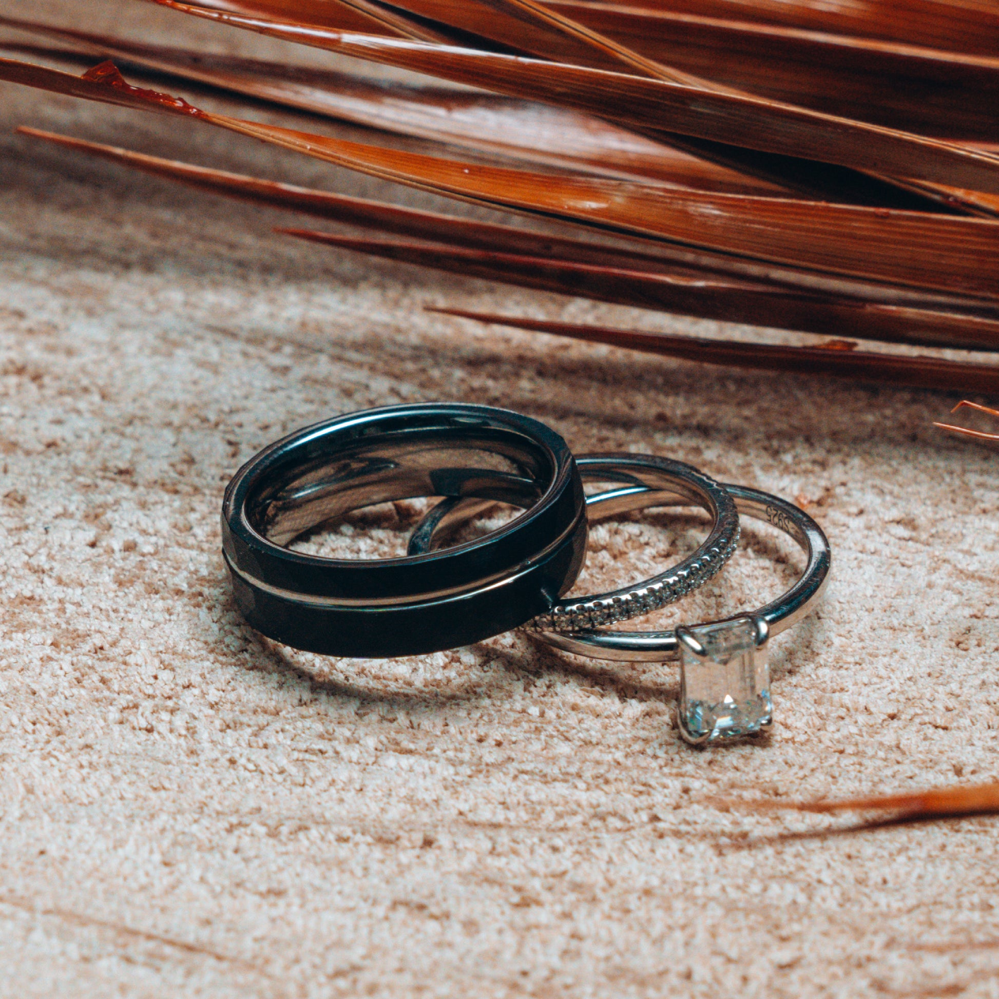 Celebrate a love that's both refined and resilient with the Letlapa & Sarona set. The Sarona ring dazzles with a 1ct emerald-cut moissanite set in sterling silver—sleek, sophisticated, and timeless. Letlapa offers a bold complement with a masculine hammered black tungsten band, detailed with a polished silver groove. Together, they tell a story of perfect balance and enduring connection.
